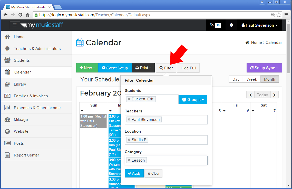 We’ve totally redesigned to way the calendar view is filtered. The student/teacher/category drop-down lists are gone, and in it’s place you’ll see a new “Filter” button. When clicked, you’ll see a popup that allows to specify the student/teacher/category/locations that you want to see. This has a few key benefits:
